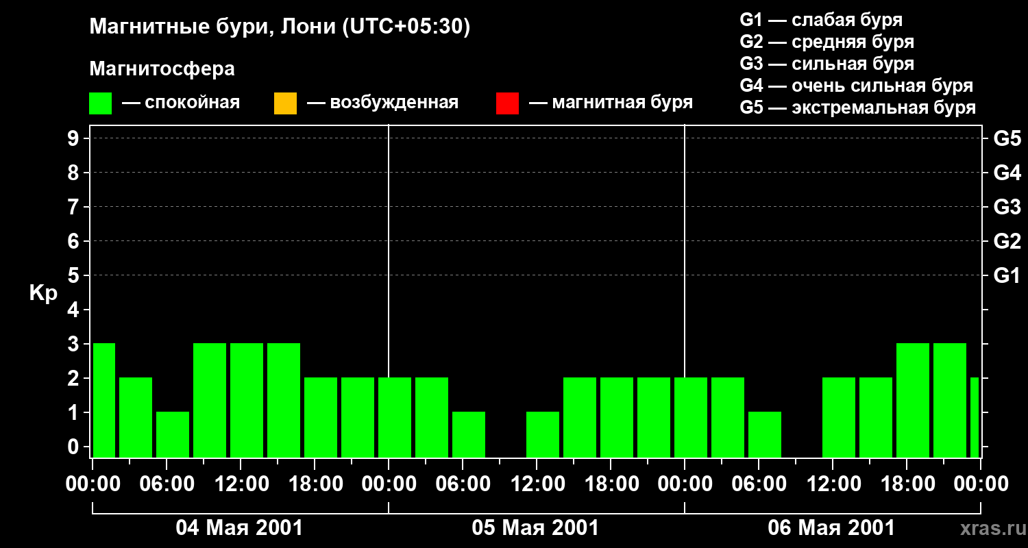 Изменения геомагнитного индекса Kp с 4 по 6 мая 2001 года для средних широт