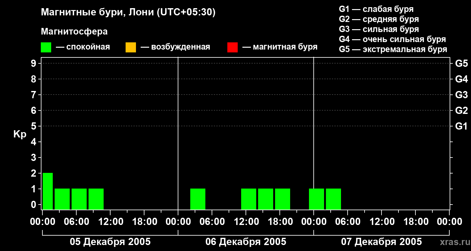 Изменения геомагнитного индекса Kp с 5 по 7 декабря 2005 года для средних широт