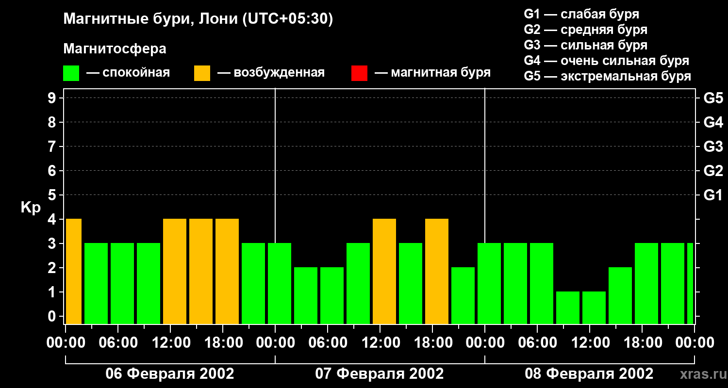Изменения геомагнитного индекса Kp с 6 по 8 февраля 2002 года для средних широт
