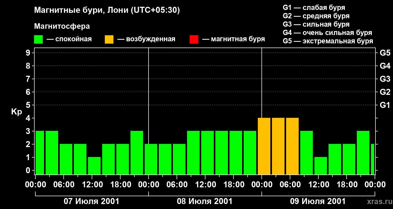 Изменения геомагнитного индекса Kp с 7 по 9 июля 2001 года для средних широт