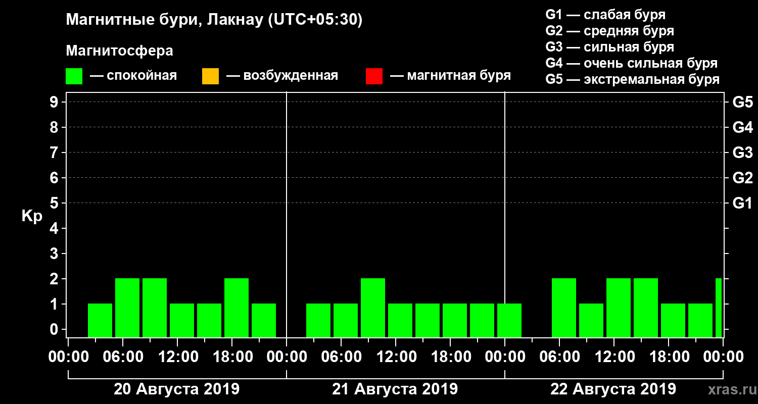 Изменения геомагнитного индекса Kp с 20 по 22 августа 2019 года для средних широт