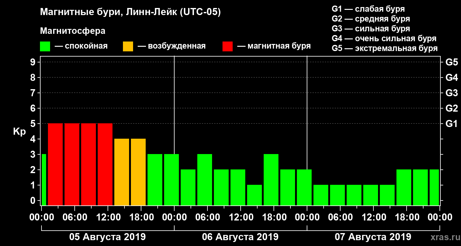 Изменения геомагнитного индекса Kp с 5 по 7 августа 2019 года для средних широт