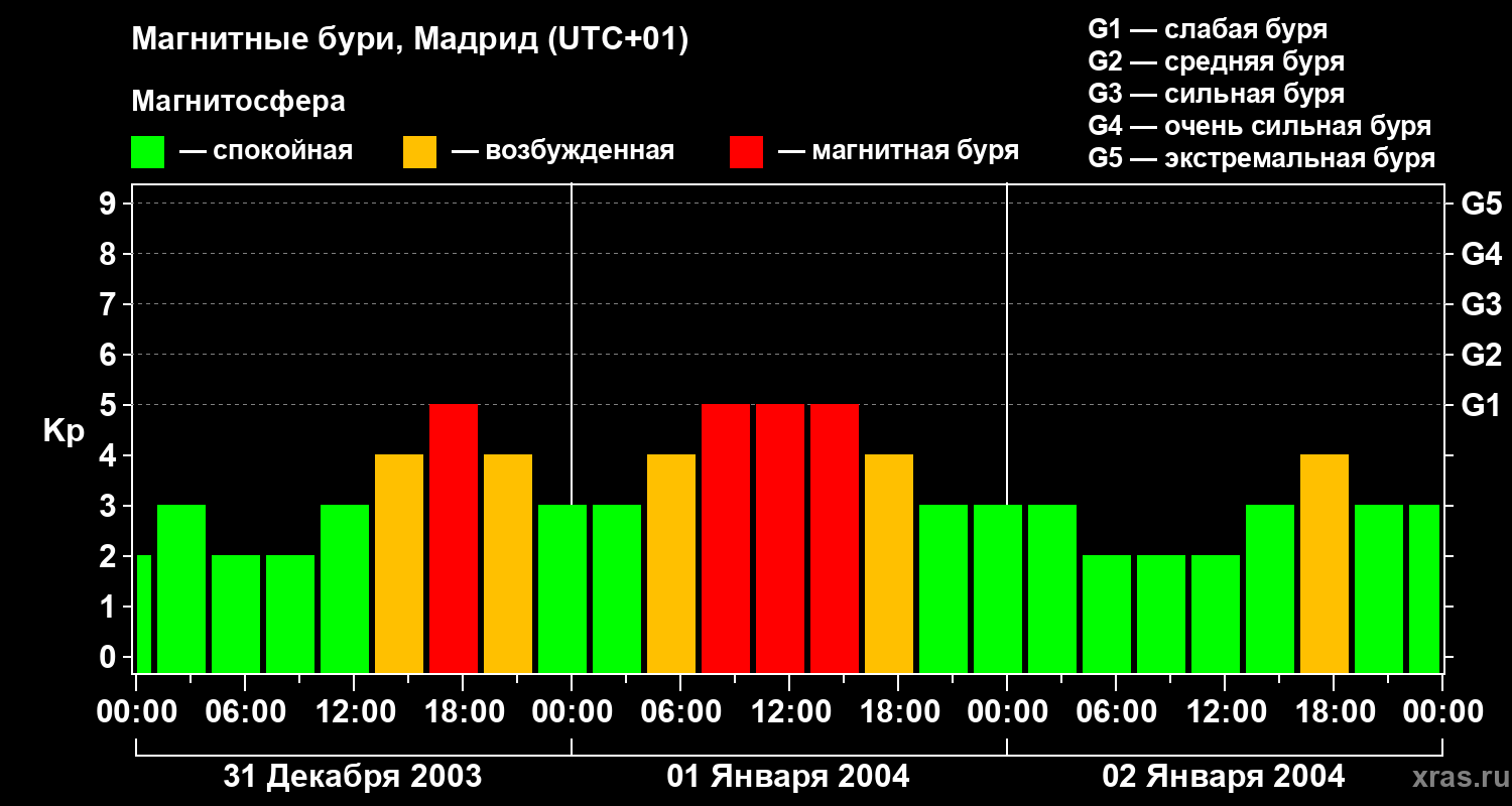 Изменения геомагнитного индекса Kp с 31 декабря 2003 года по 2 января 2004 года для средних широт