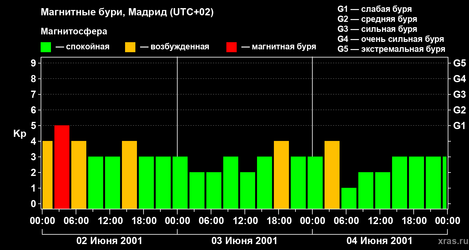 Изменения геомагнитного индекса Kp с 2 по 4 июня 2001 года для средних широт