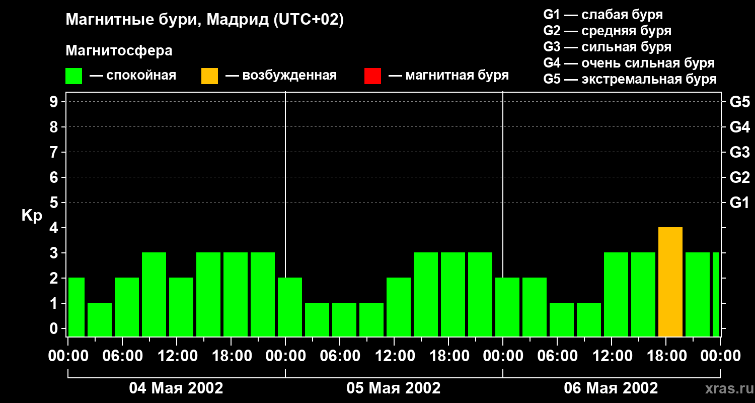 Изменения геомагнитного индекса Kp с 4 по 6 мая 2002 года для средних широт