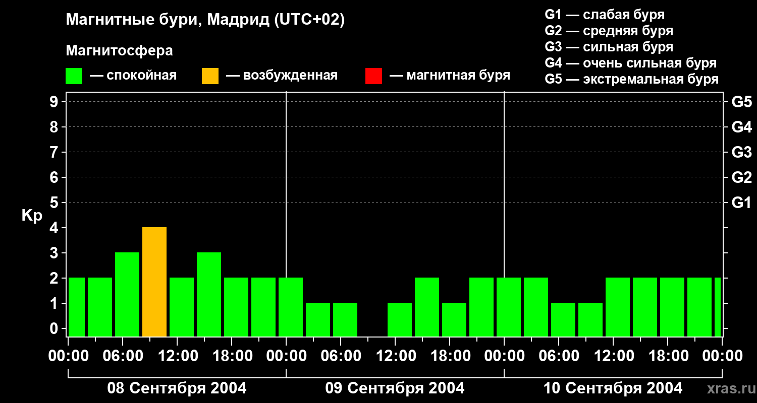 Изменения геомагнитного индекса Kp с 8 по 10 сентября 2004 года для средних широт