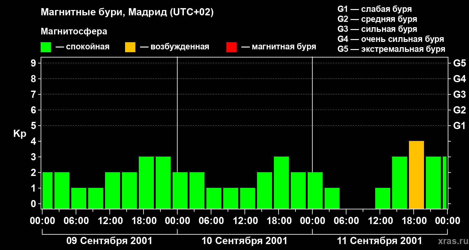 Изменения геомагнитного индекса Kp с 9 по 11 сентября 2001 года для средних широт