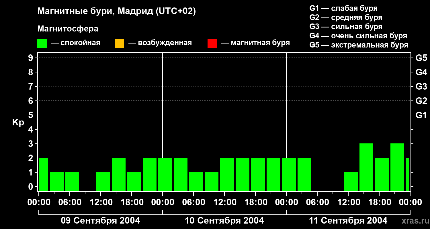 Изменения геомагнитного индекса Kp с 9 по 11 сентября 2004 года для средних широт