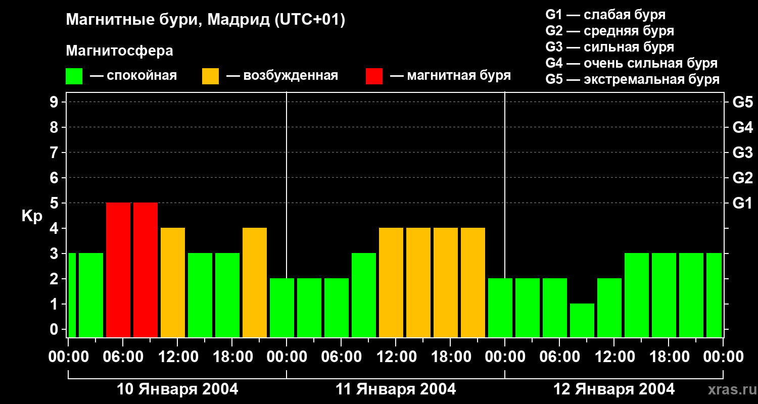 Изменения геомагнитного индекса Kp с 10 по 12 января 2004 года для средних широт