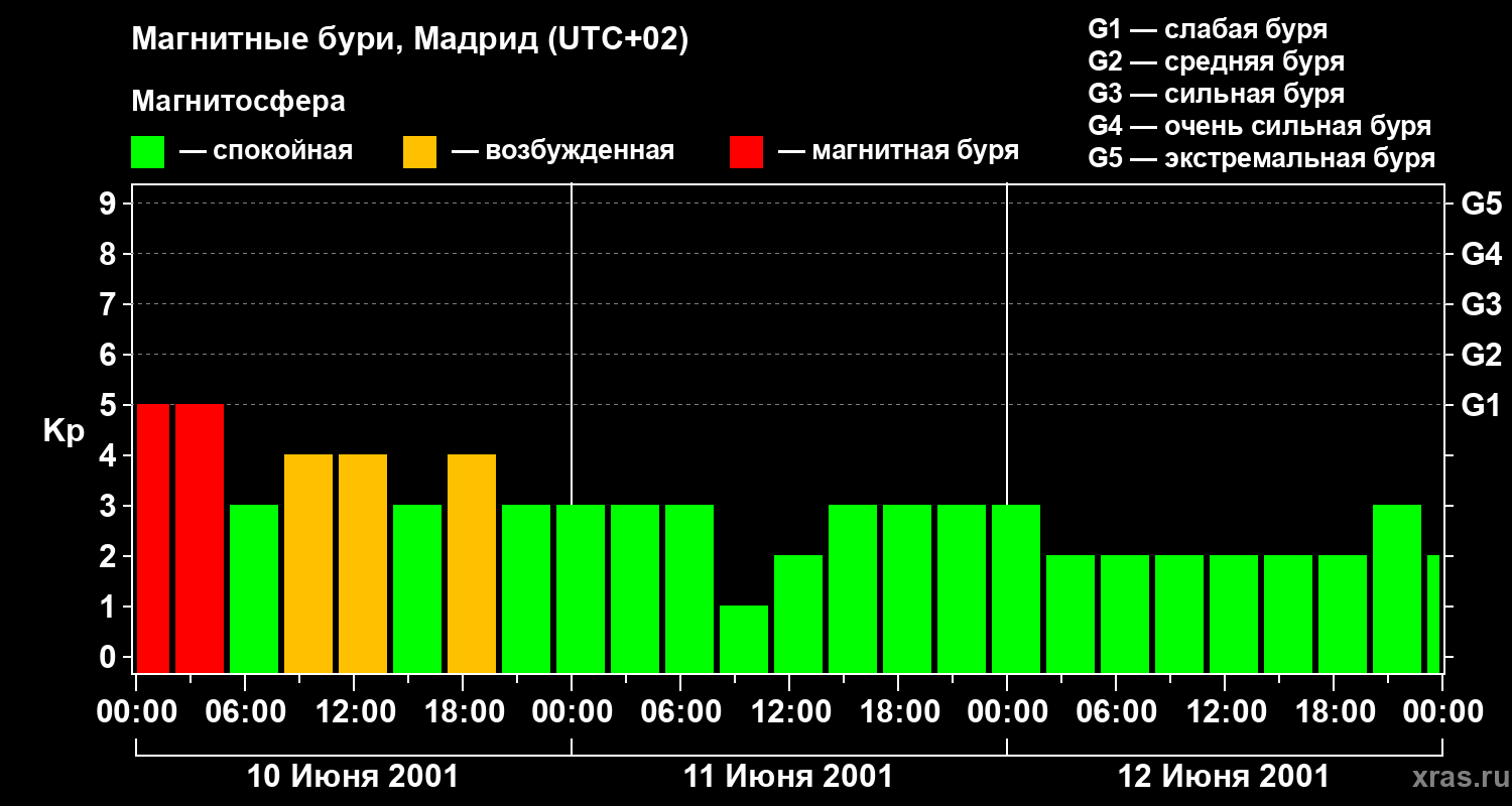 Изменения геомагнитного индекса Kp с 10 по 12 июня 2001 года для средних широт