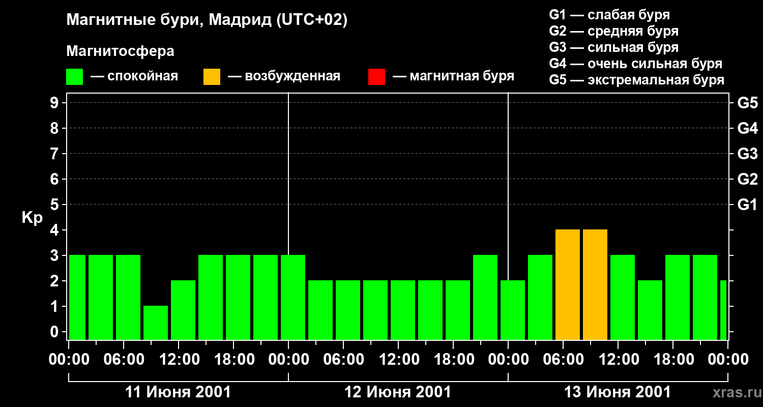 Изменения геомагнитного индекса Kp с 11 по 13 июня 2001 года для средних широт