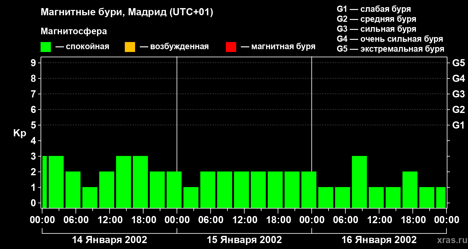 Изменения геомагнитного индекса Kp с 14 по 16 января 2002 года для средних широт
