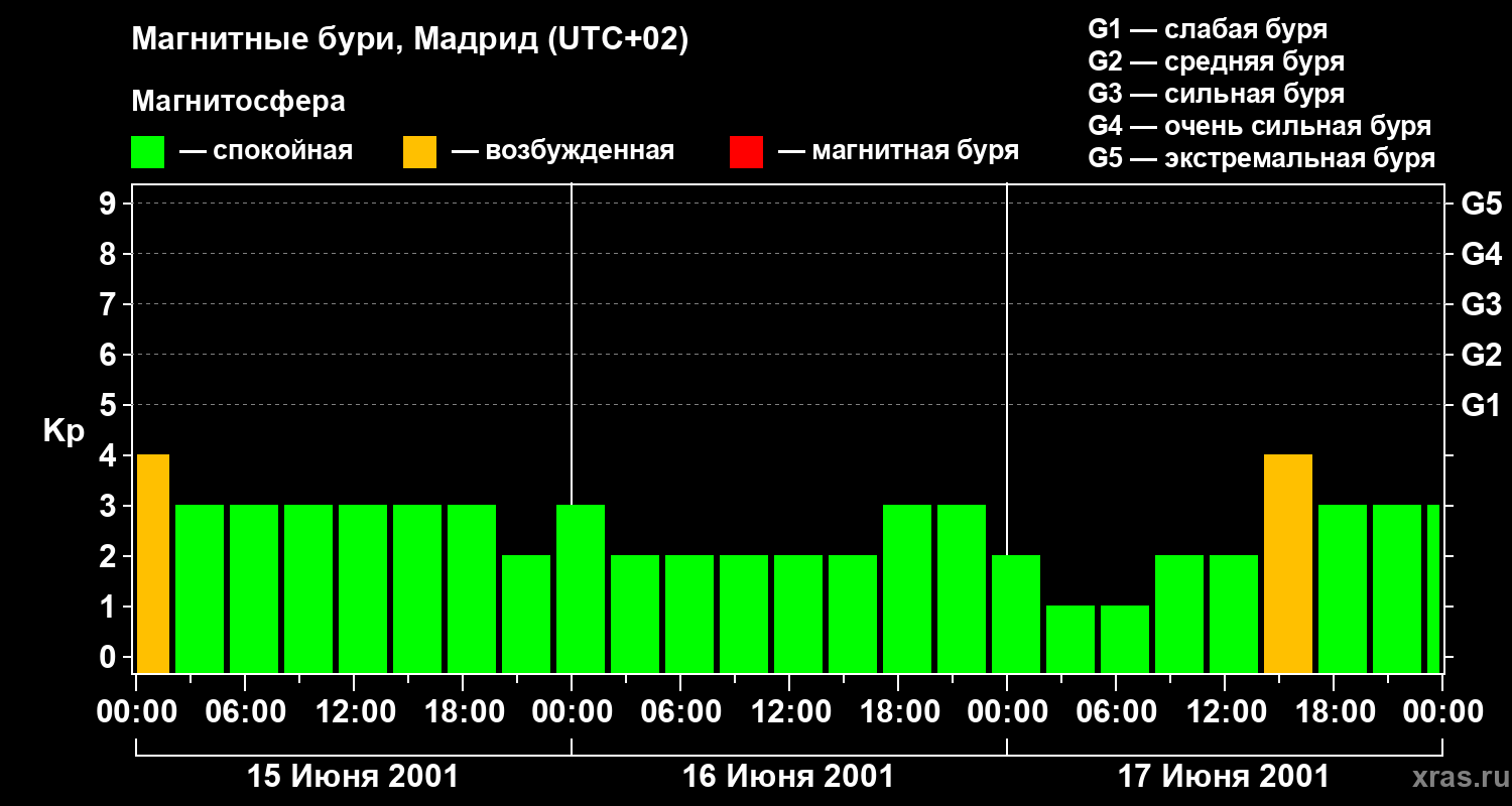 Изменения геомагнитного индекса Kp с 15 по 17 июня 2001 года для средних широт
