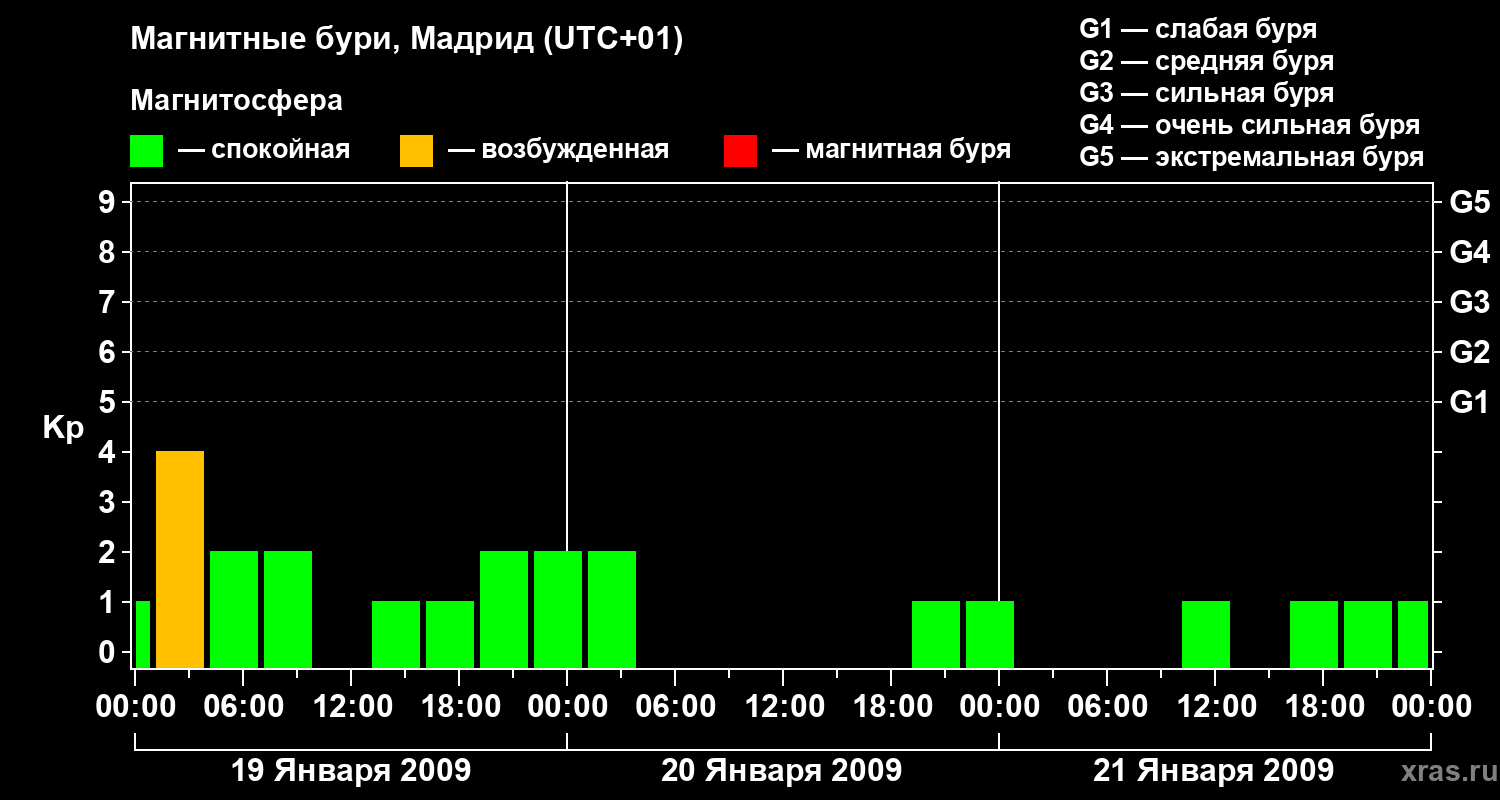 Изменения геомагнитного индекса Kp с 19 по 21 января 2009 года для средних широт