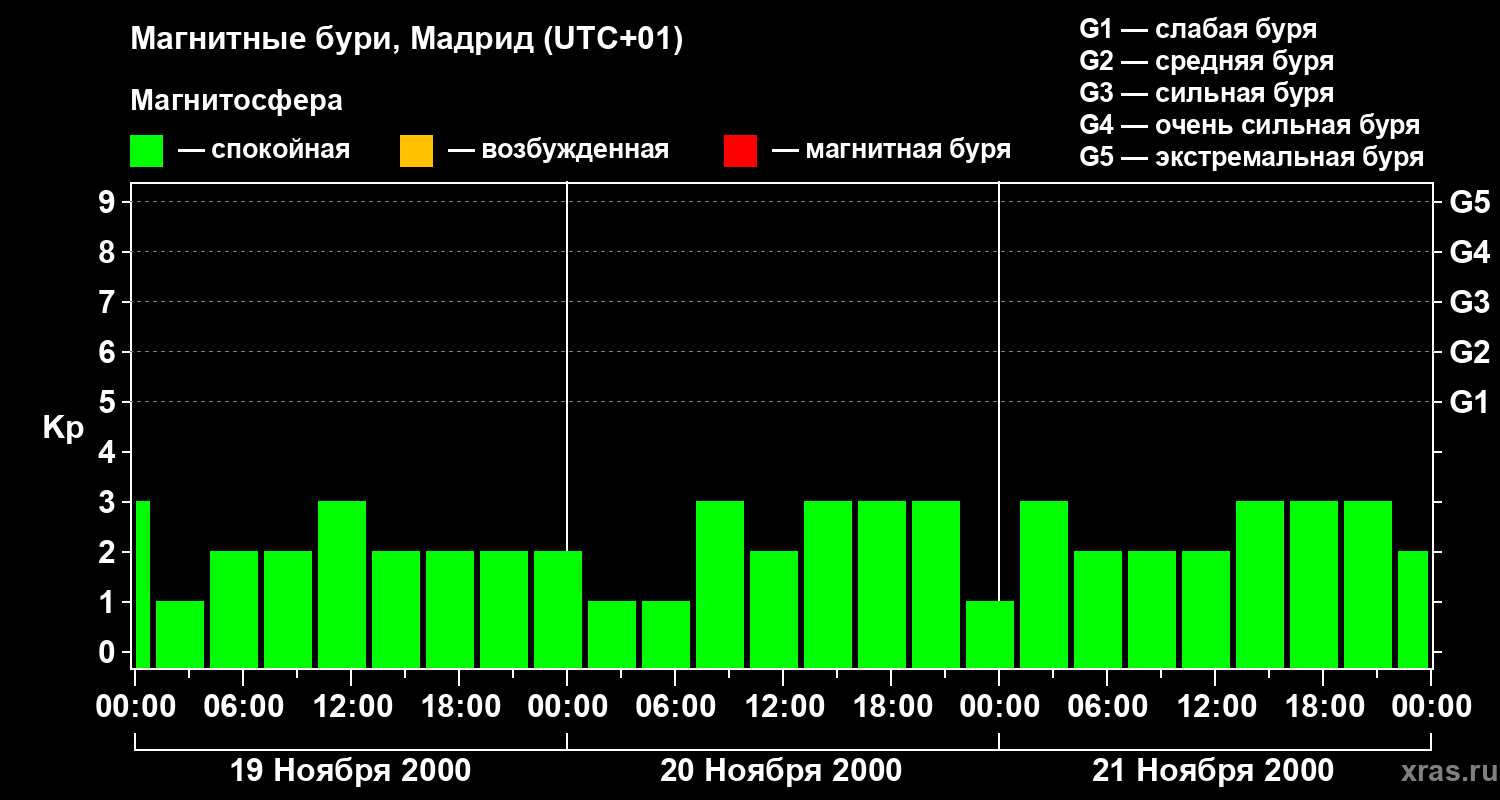 Изменения геомагнитного индекса Kp с 19 по 21 ноября 2000 года для средних широт