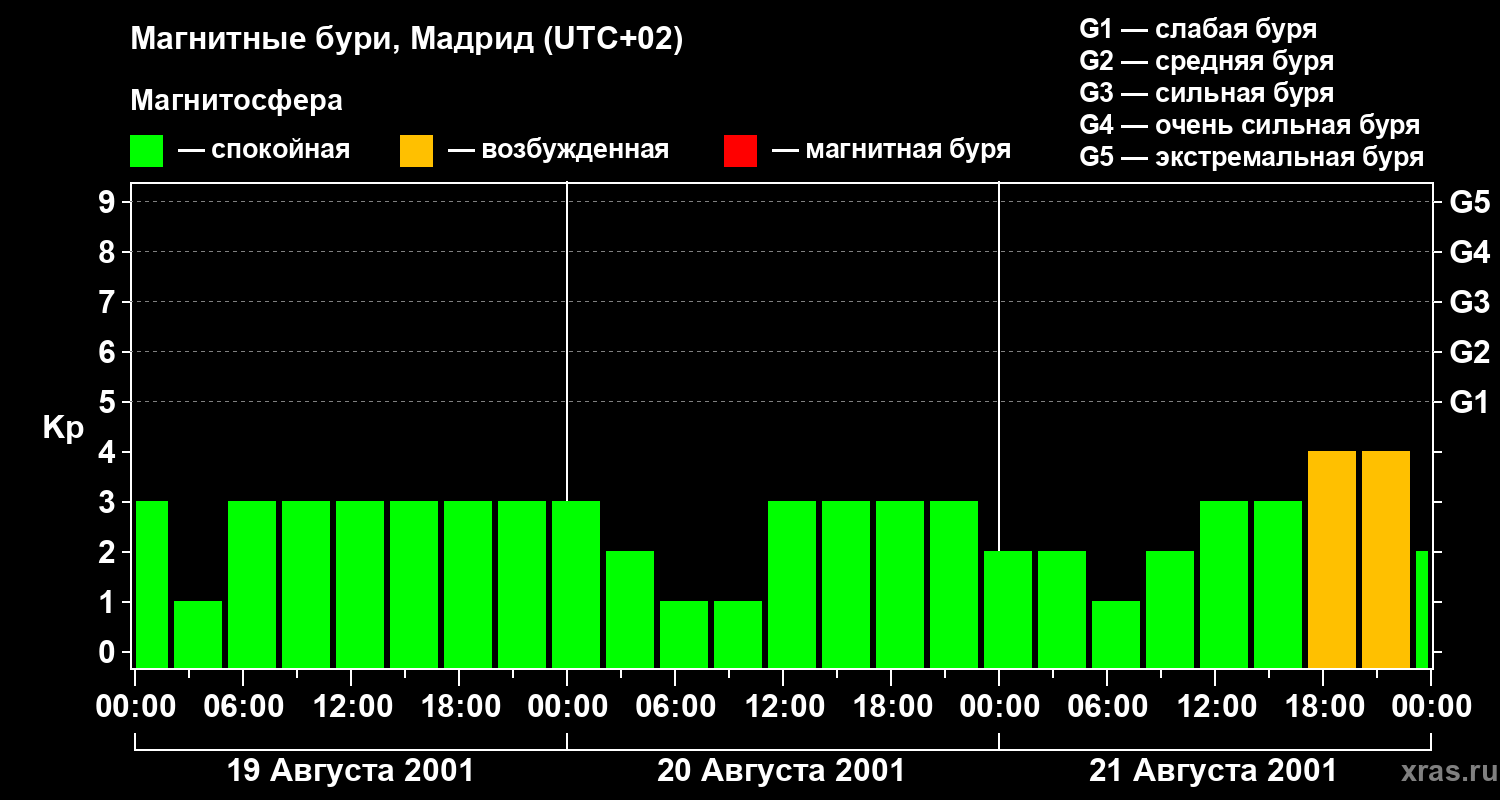 Изменения геомагнитного индекса Kp с 19 по 21 августа 2001 года для средних широт