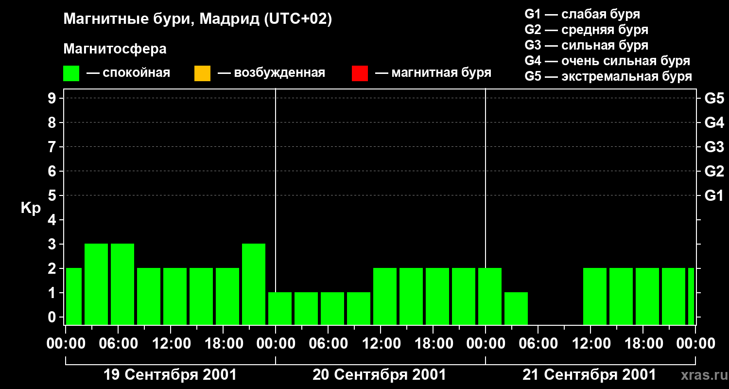 Изменения геомагнитного индекса Kp с 19 по 21 сентября 2001 года для средних широт
