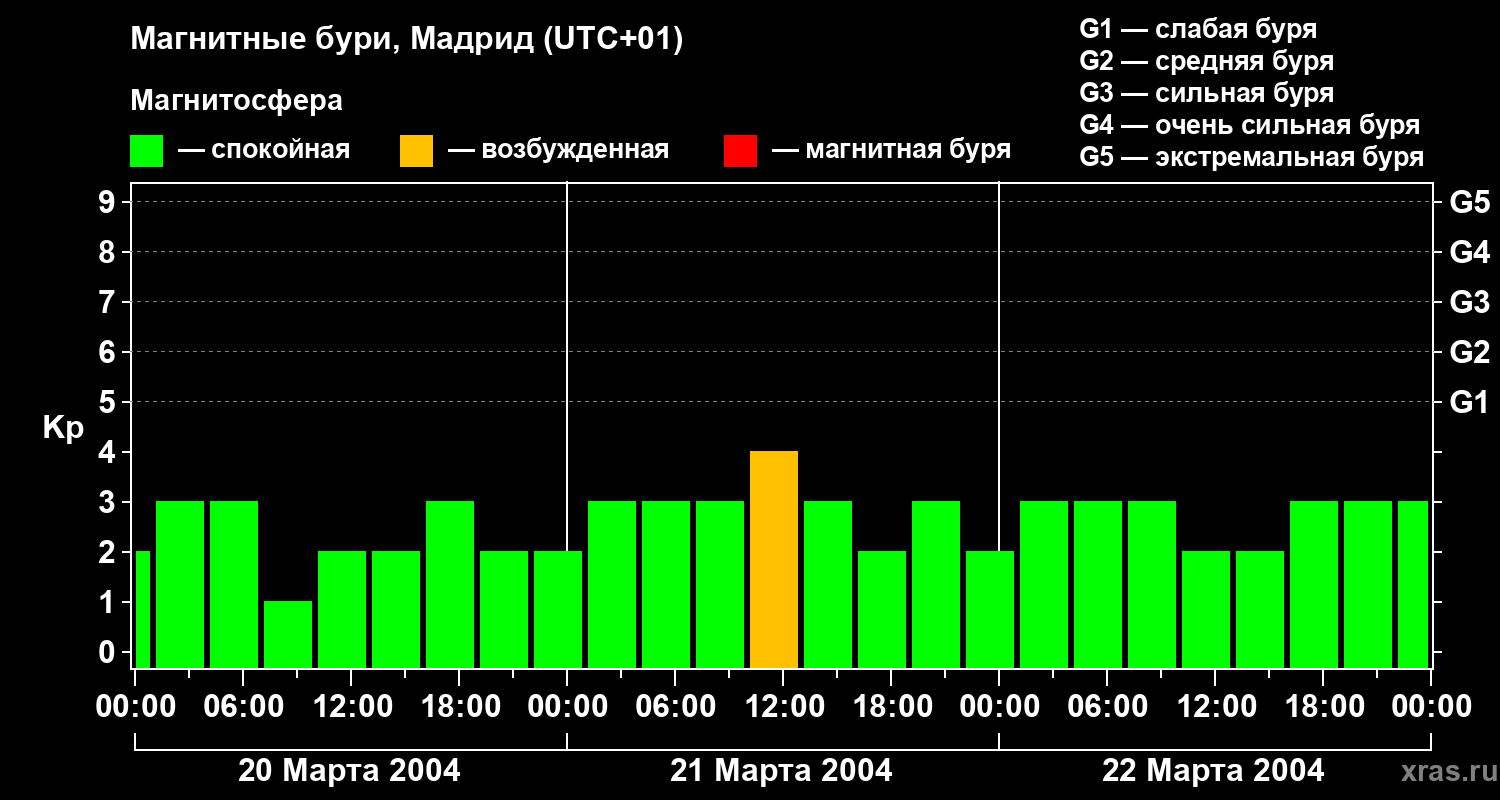 Изменения геомагнитного индекса Kp с 20 по 22 марта 2004 года для средних широт