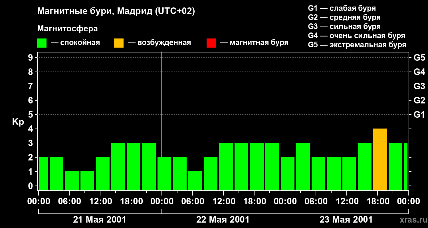Изменения геомагнитного индекса Kp с 21 по 23 мая 2001 года для средних широт