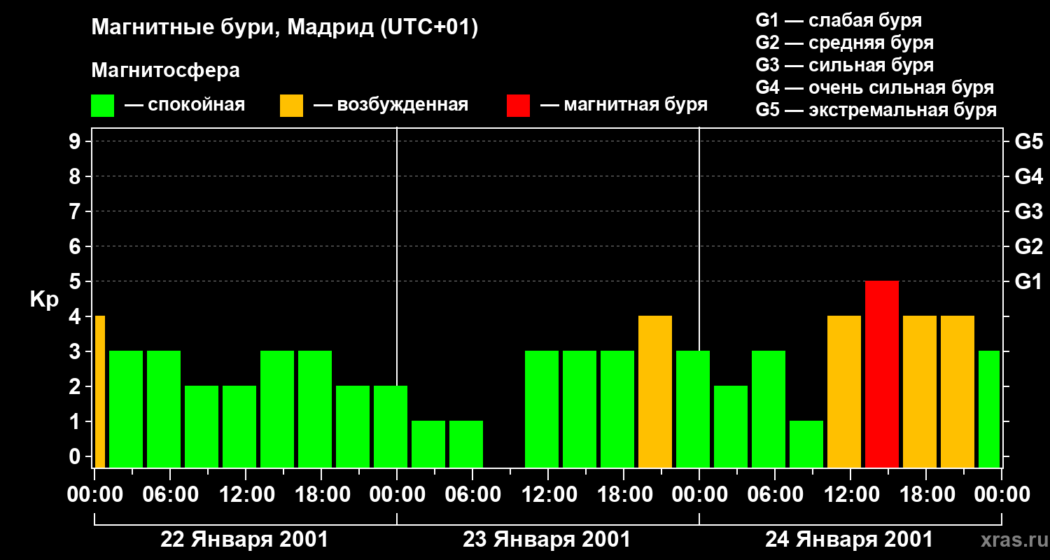 Изменения геомагнитного индекса Kp с 22 по 24 января 2001 года для средних широт