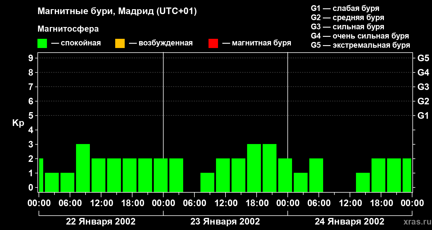 Изменения геомагнитного индекса Kp с 22 по 24 января 2002 года для средних широт