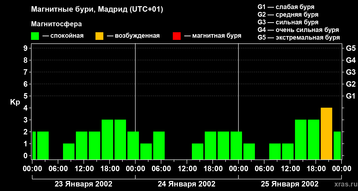 Изменения геомагнитного индекса Kp с 23 по 25 января 2002 года для средних широт