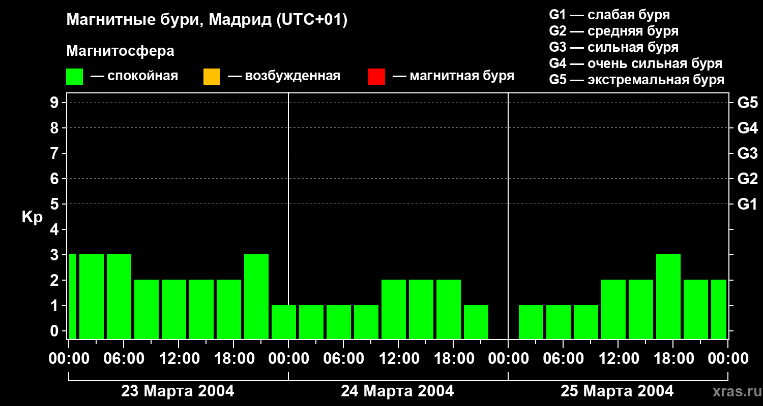 Изменения геомагнитного индекса Kp с 23 по 25 марта 2004 года для средних широт