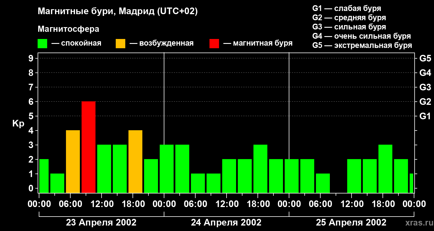 Изменения геомагнитного индекса Kp с 23 по 25 апреля 2002 года для средних широт
