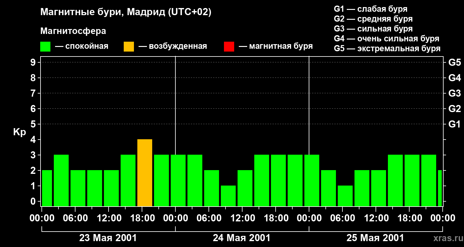 Изменения геомагнитного индекса Kp с 23 по 25 мая 2001 года для средних широт