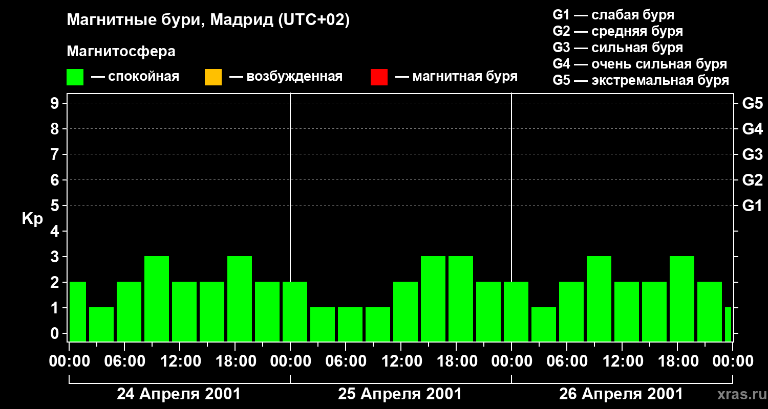 Изменения геомагнитного индекса Kp с 24 по 26 апреля 2001 года для средних широт