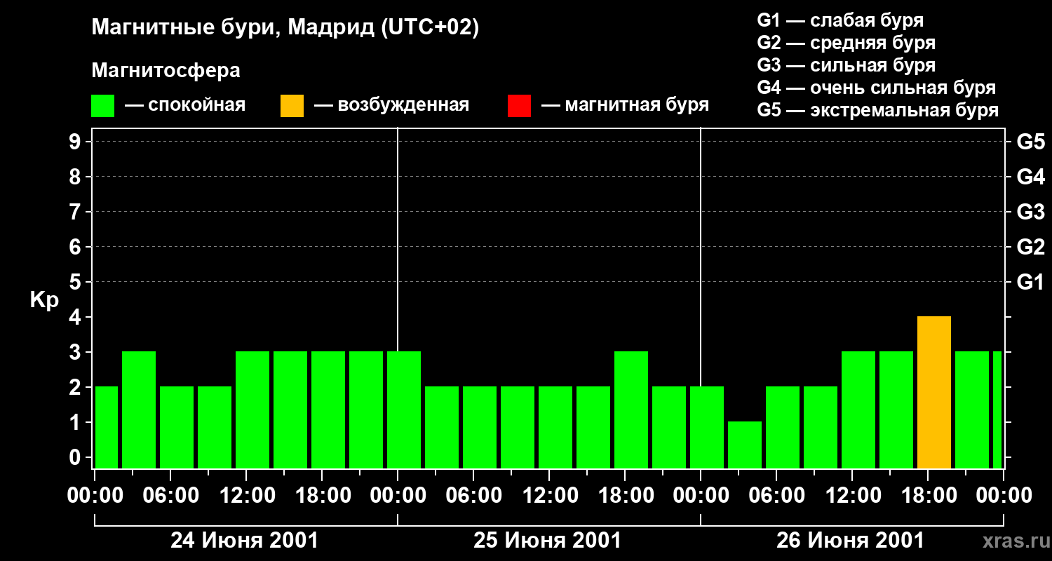 Изменения геомагнитного индекса Kp с 24 по 26 июня 2001 года для средних широт