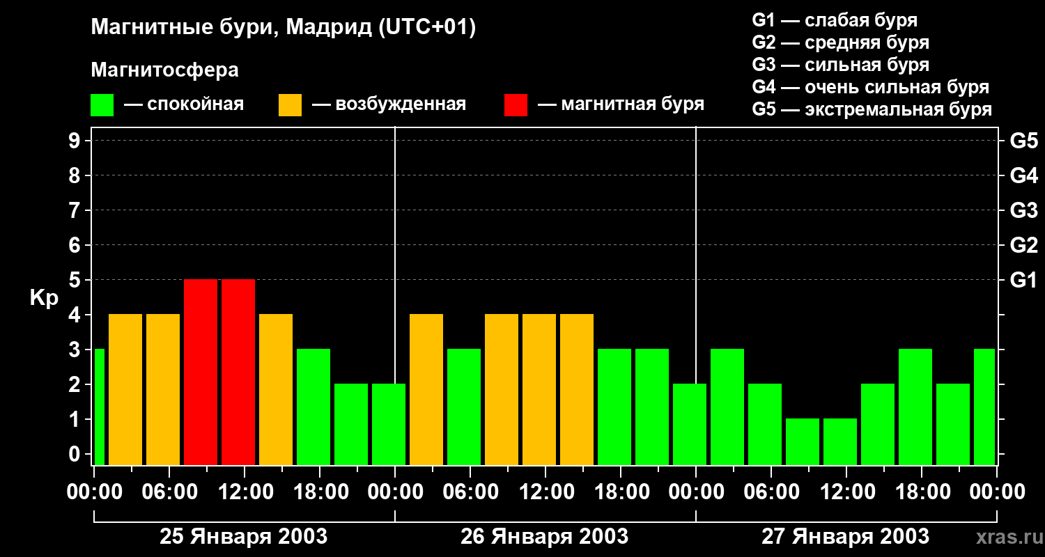 Изменения геомагнитного индекса Kp с 25 по 27 января 2003 года для средних широт