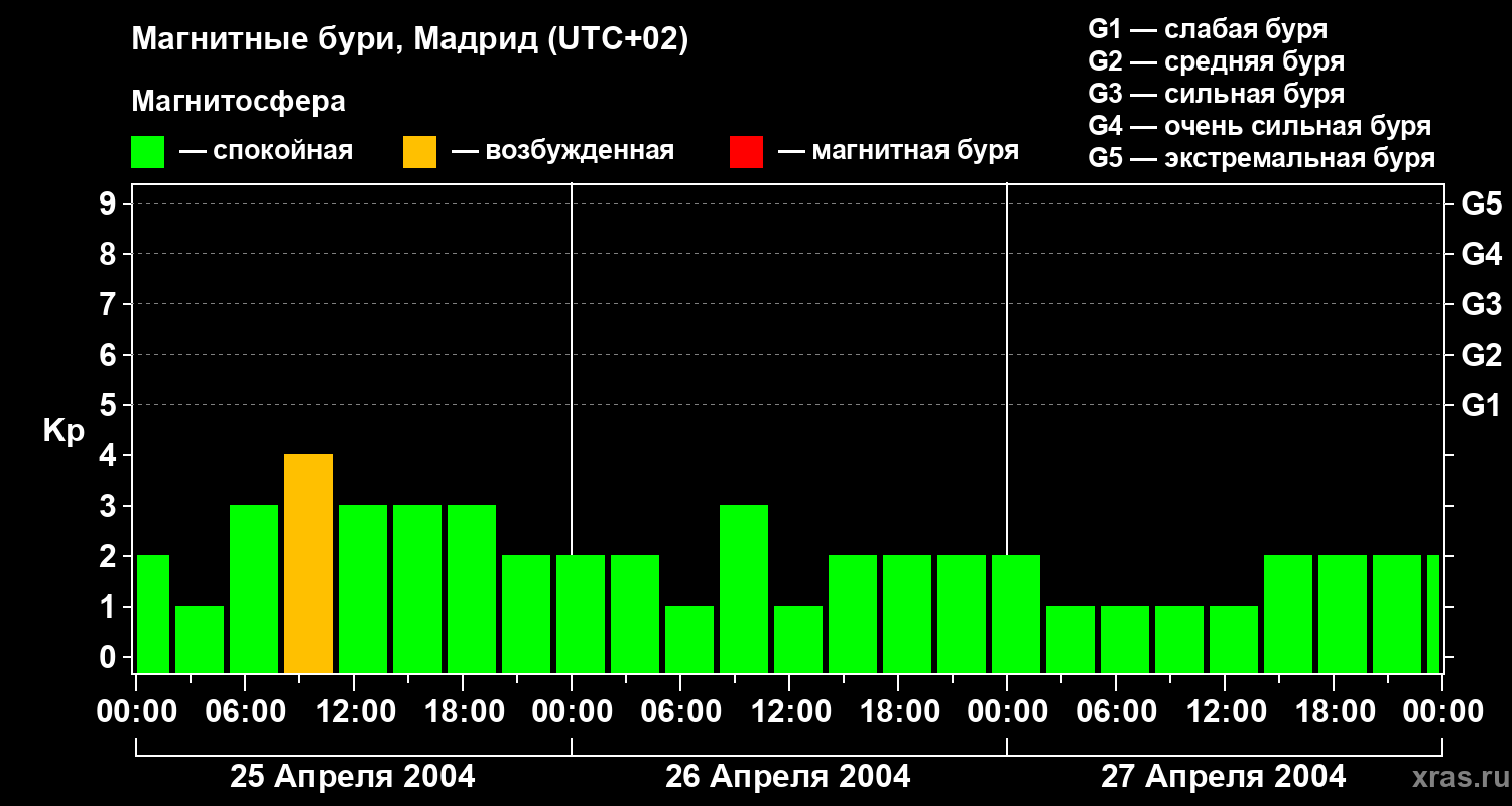 Изменения геомагнитного индекса Kp с 25 по 27 апреля 2004 года для средних широт