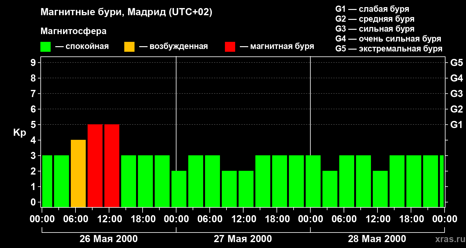 Изменения геомагнитного индекса Kp с 26 по 28 мая 2000 года для средних широт