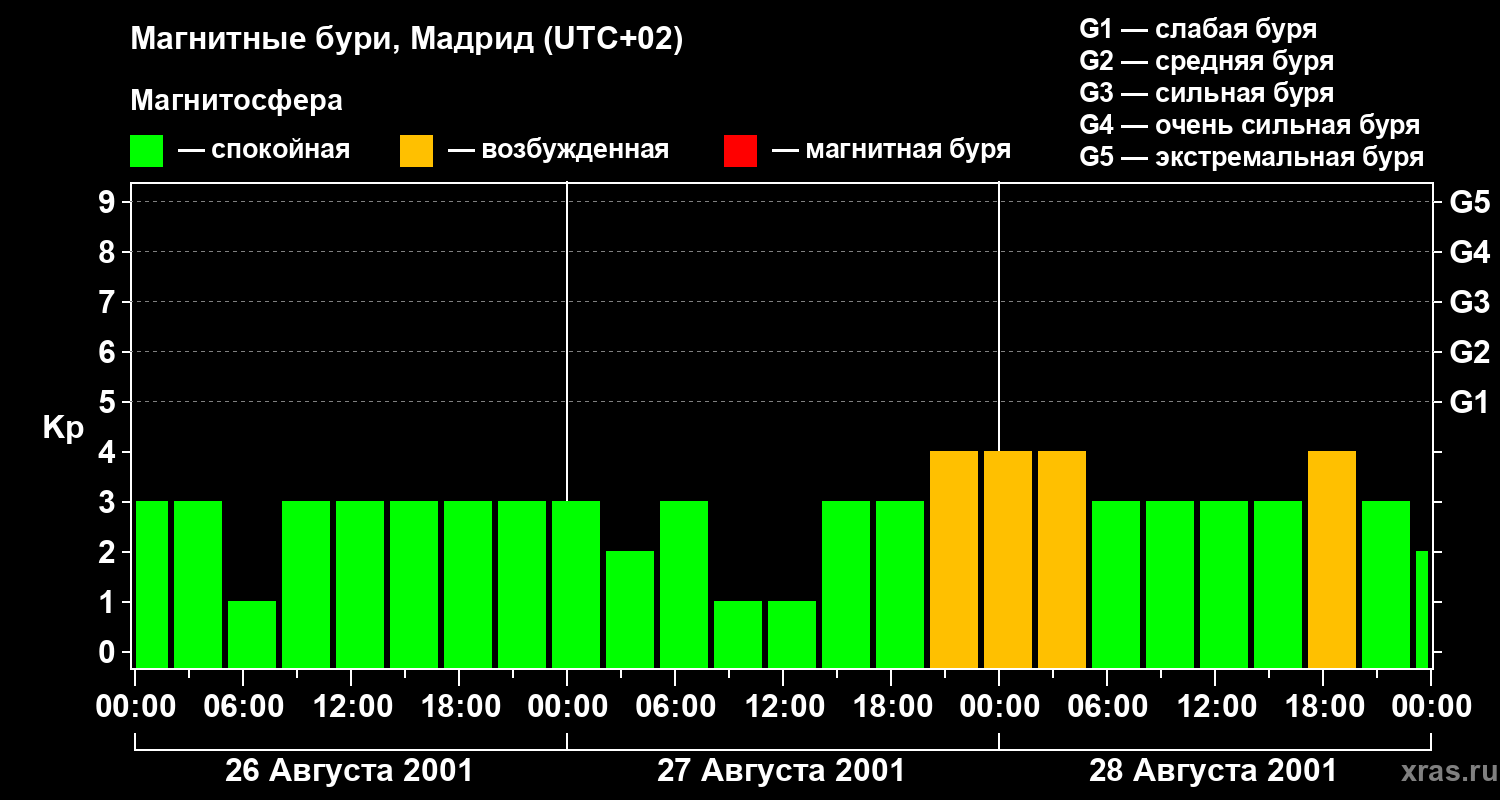 Изменения геомагнитного индекса Kp с 26 по 28 августа 2001 года для средних широт