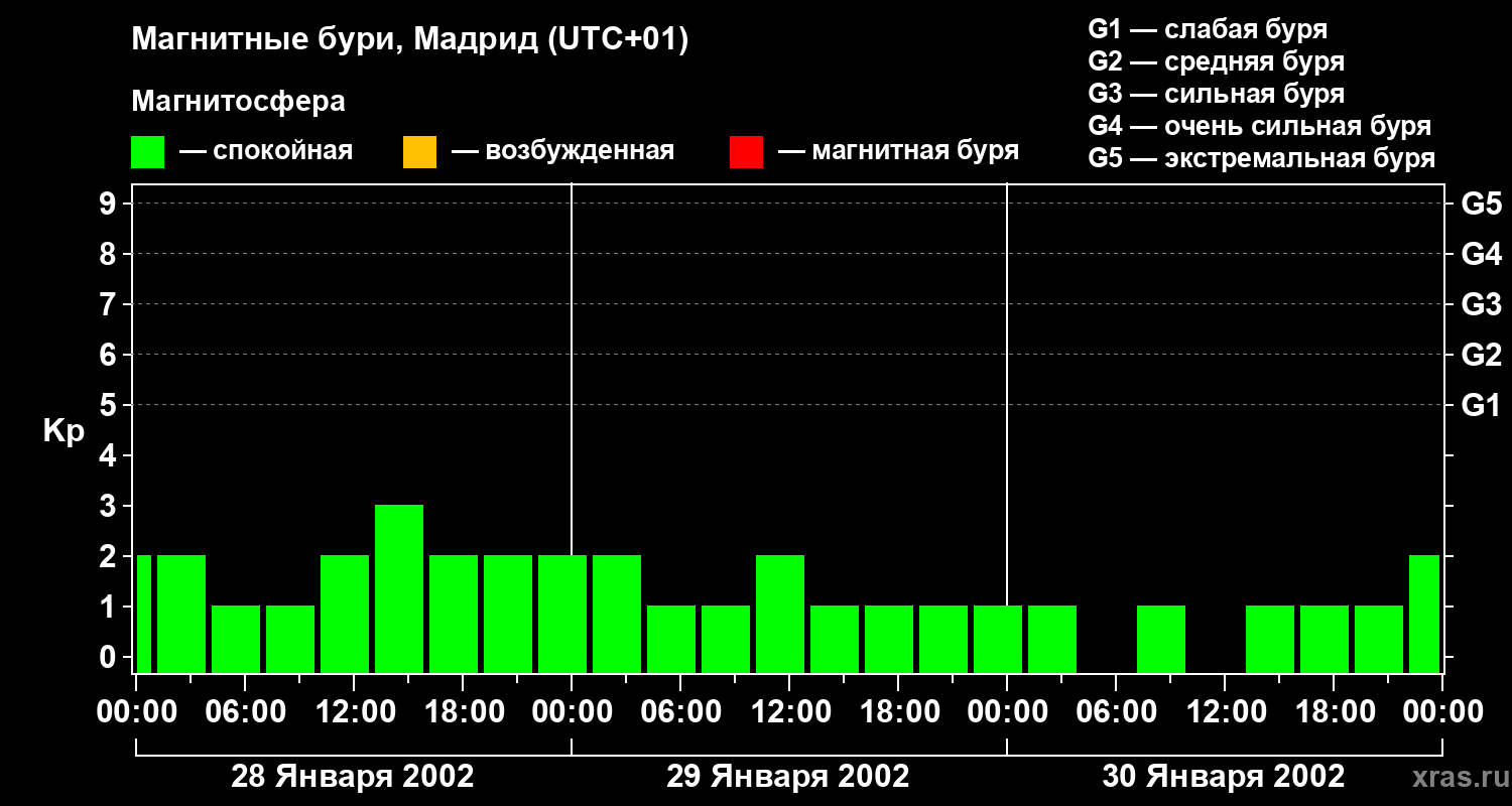 Изменения геомагнитного индекса Kp с 28 по 30 января 2002 года для средних широт