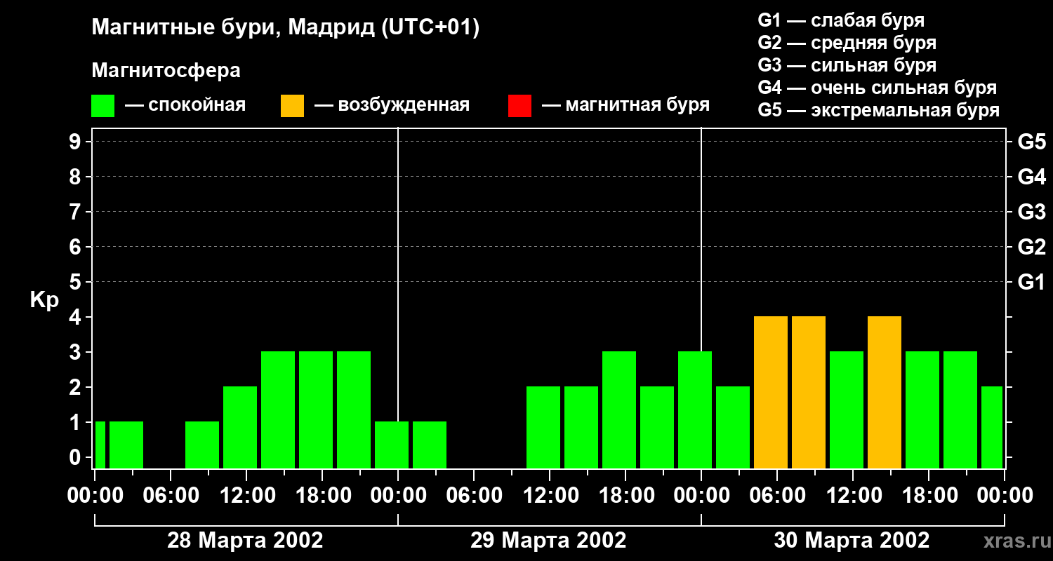 Изменения геомагнитного индекса Kp с 28 по 30 марта 2002 года для средних широт