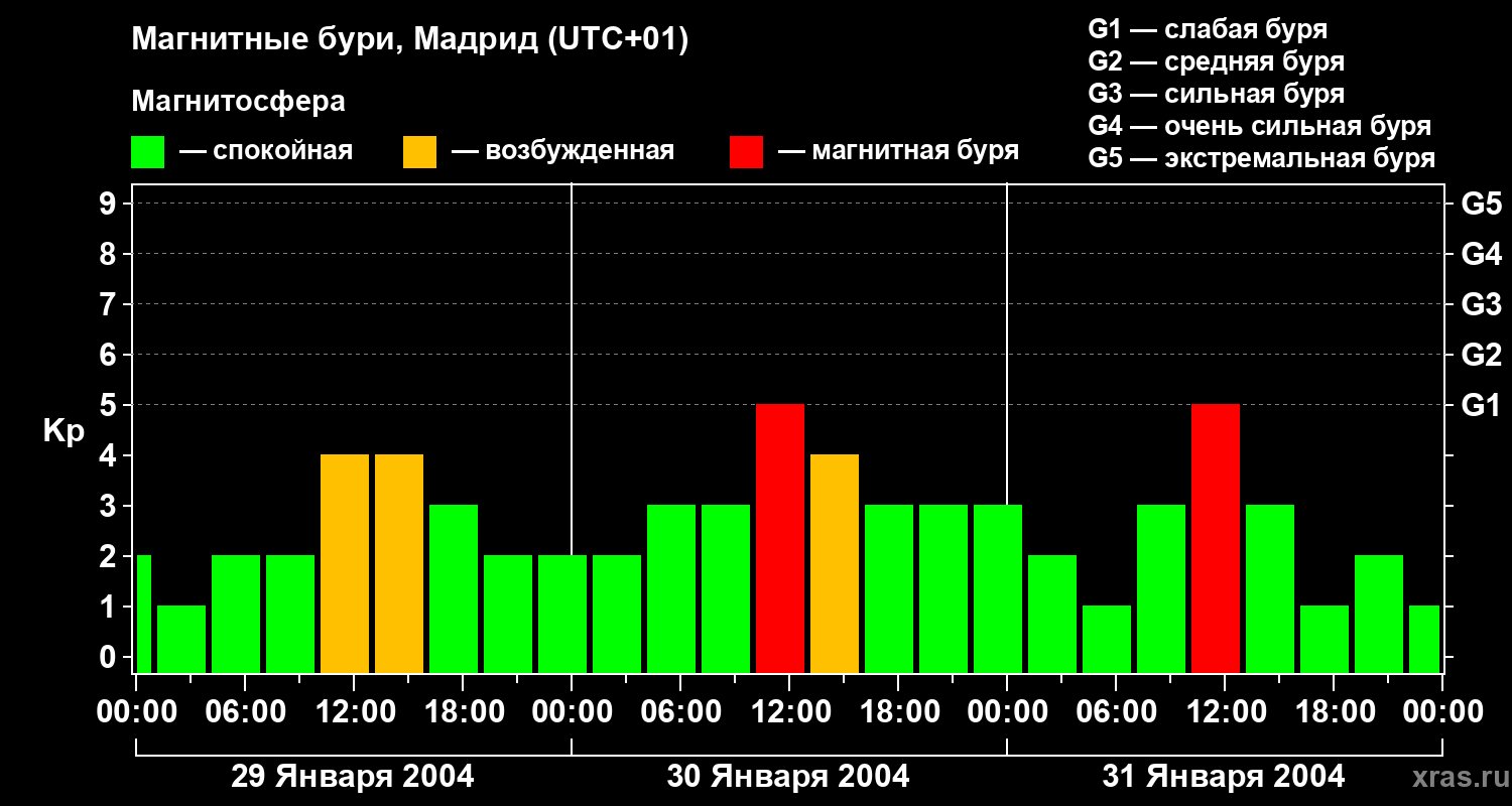 Изменения геомагнитного индекса Kp с 29 по 31 января 2004 года для средних широт