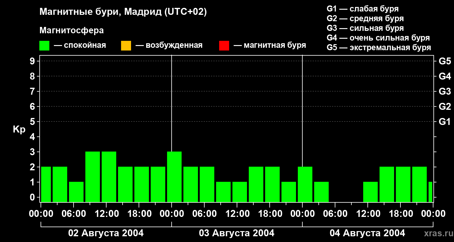 Изменения геомагнитного индекса Kp с 2 по 4 августа 2004 года для средних широт
