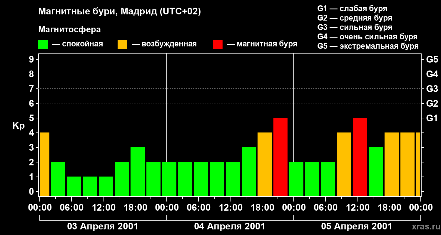 Изменения геомагнитного индекса Kp с 3 по 5 апреля 2001 года для средних широт