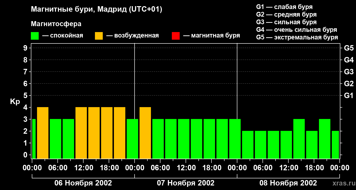Изменения геомагнитного индекса Kp с 6 по 8 ноября 2002 года для средних широт