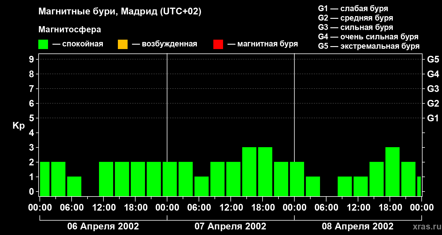 Изменения геомагнитного индекса Kp с 6 по 8 апреля 2002 года для средних широт