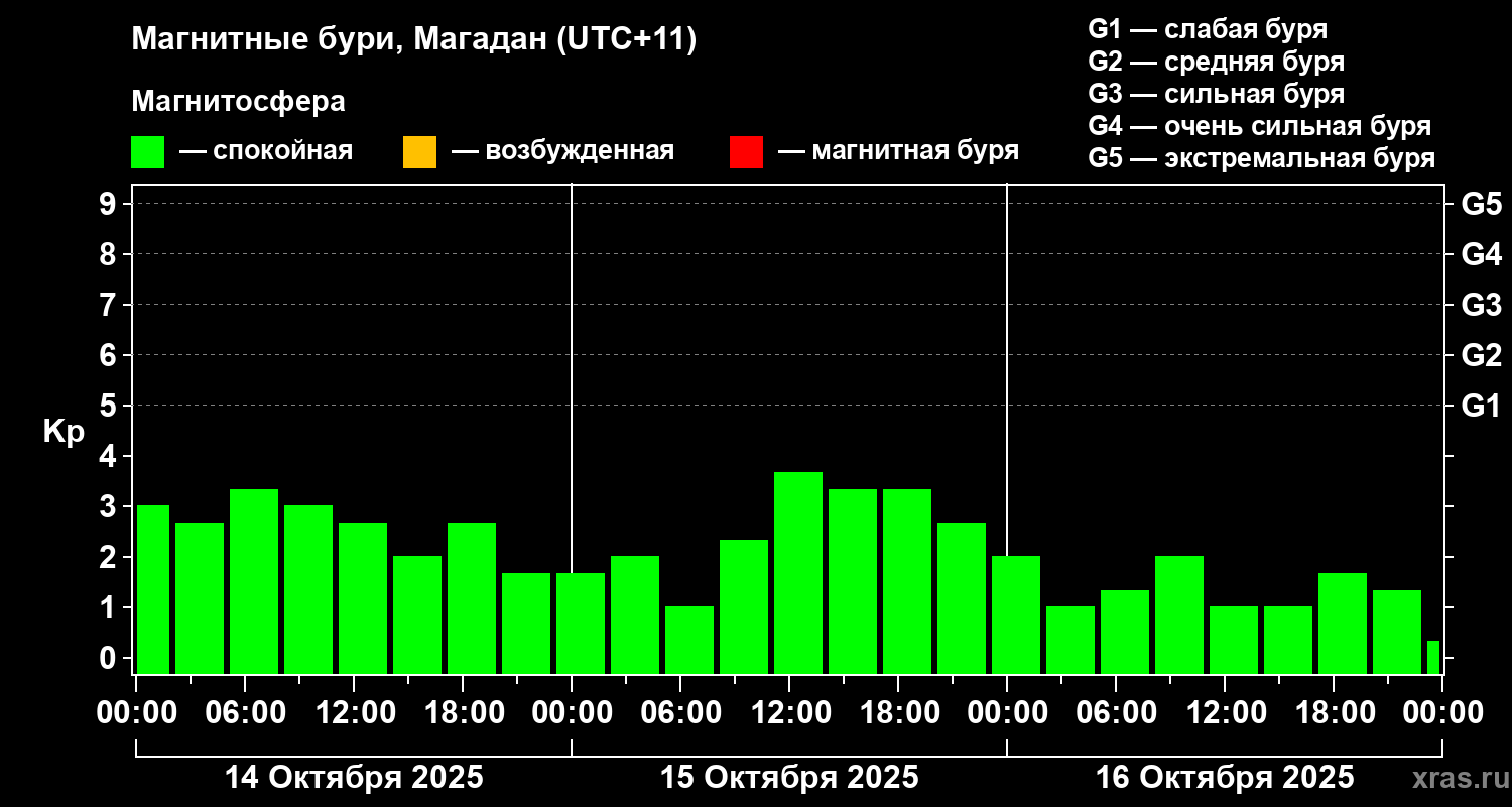 Изменения геомагнитного индекса Kp с 14 по 16 октября 2025 года для средних широт