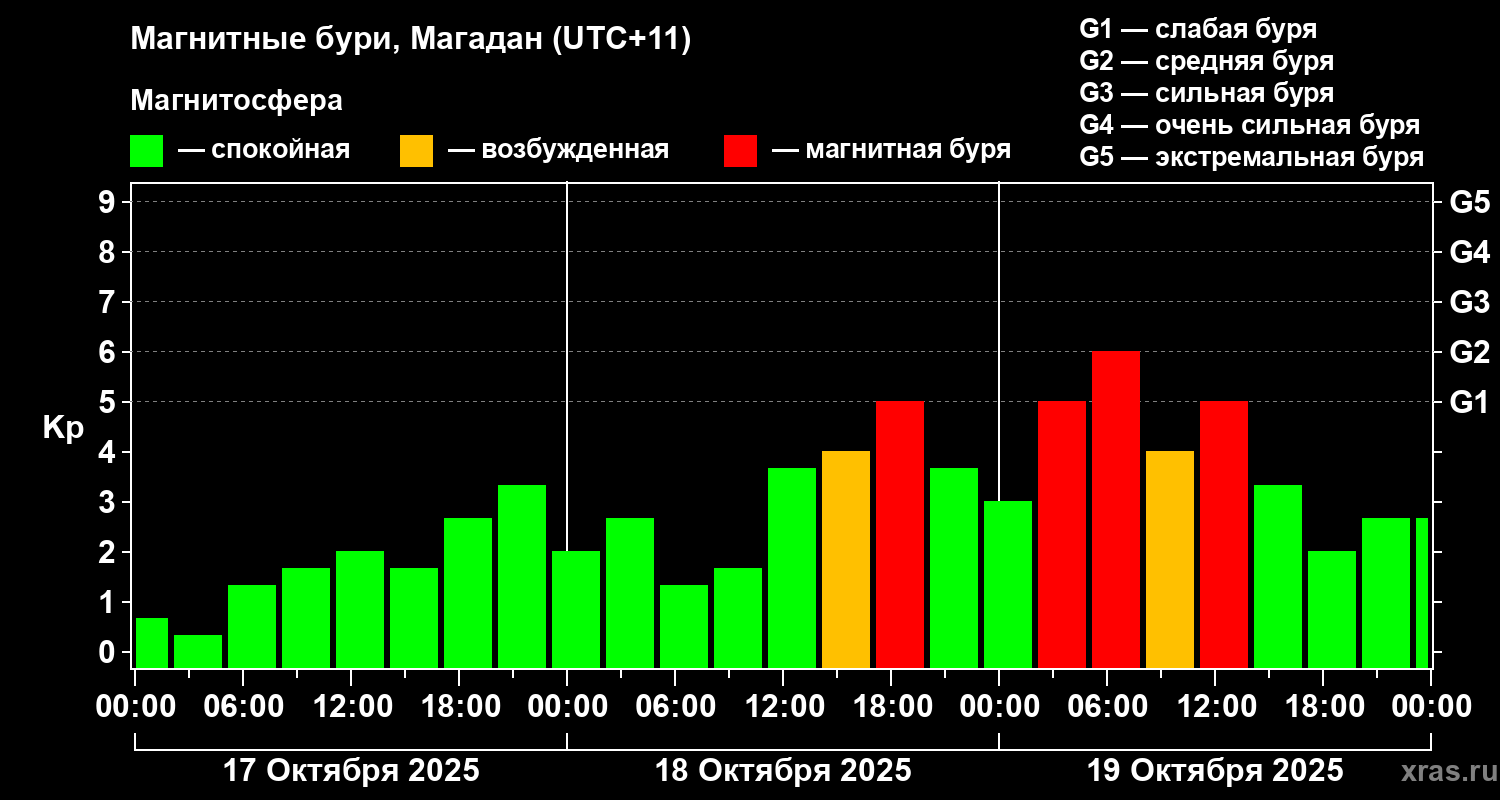 Изменения геомагнитного индекса Kp с 17 по 19 октября 2025 года для средних широт