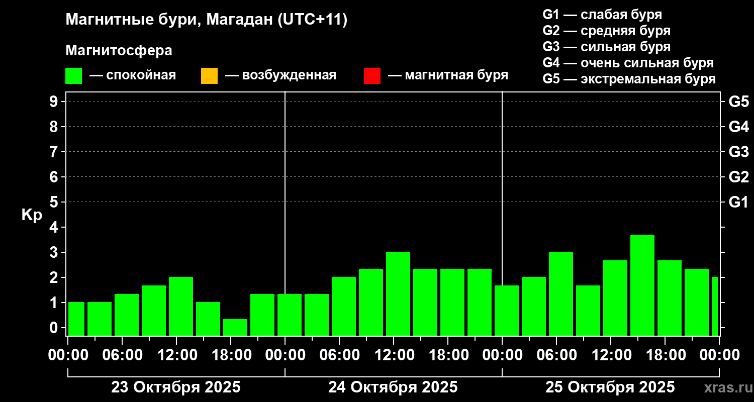 Изменения геомагнитного индекса Kp с 23 по 25 октября 2025 года для средних широт