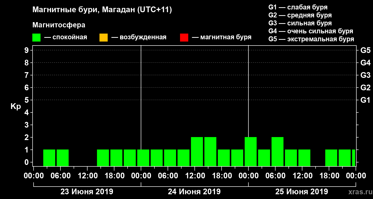 Изменения геомагнитного индекса Kp с 23 по 25 июня 2019 года для средних широт