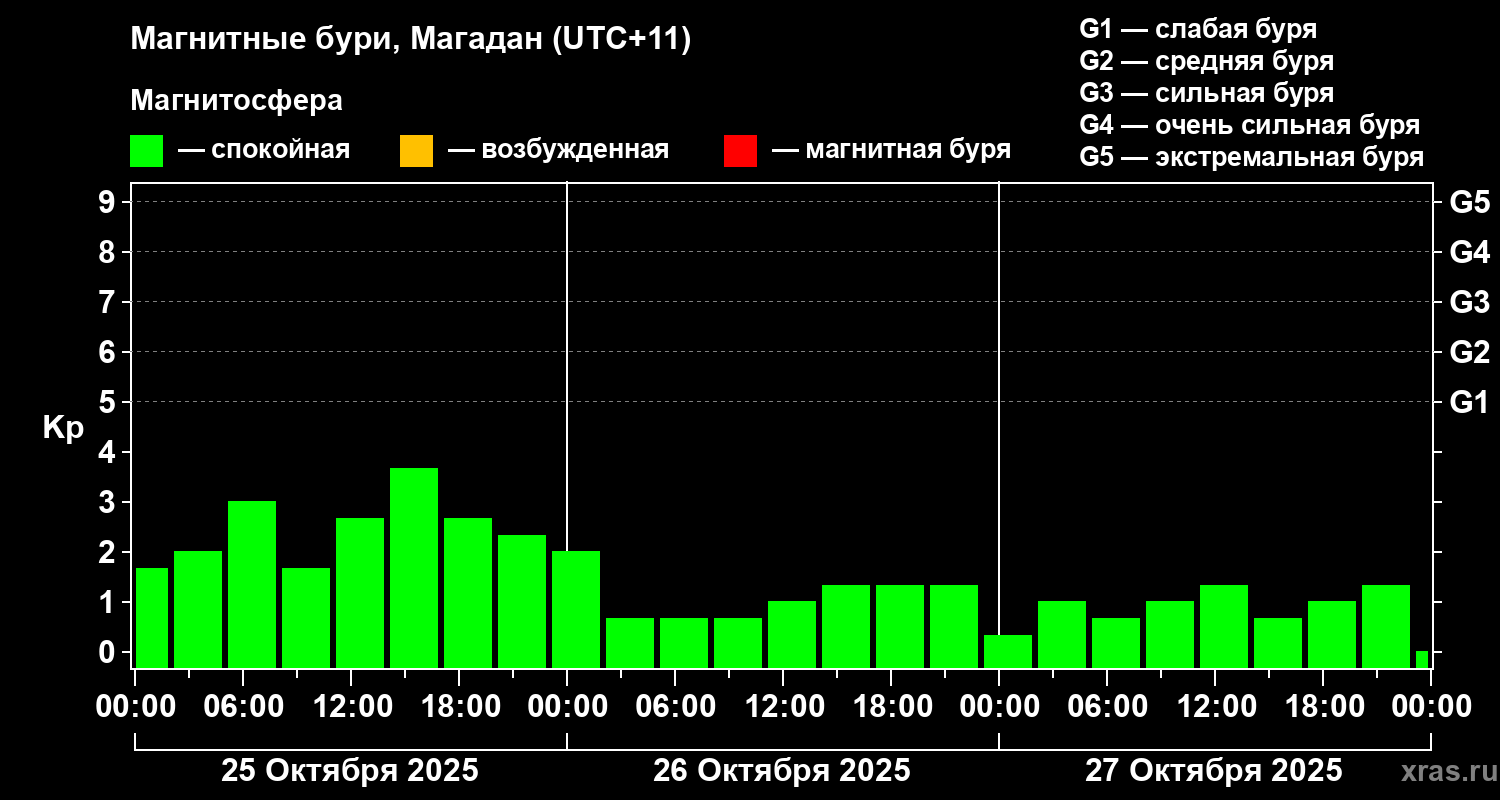 Изменения геомагнитного индекса Kp с 25 по 27 октября 2025 года для средних широт