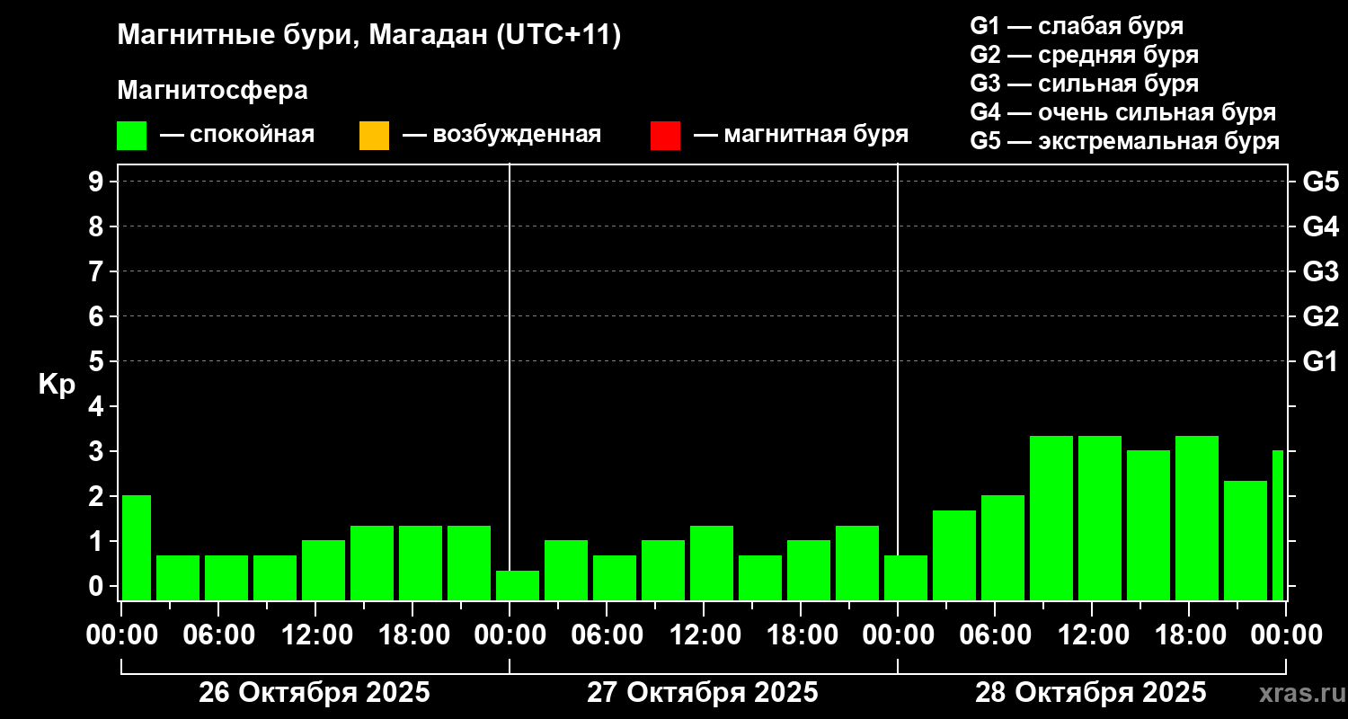 Изменения геомагнитного индекса Kp с 26 по 28 октября 2025 года для средних широт