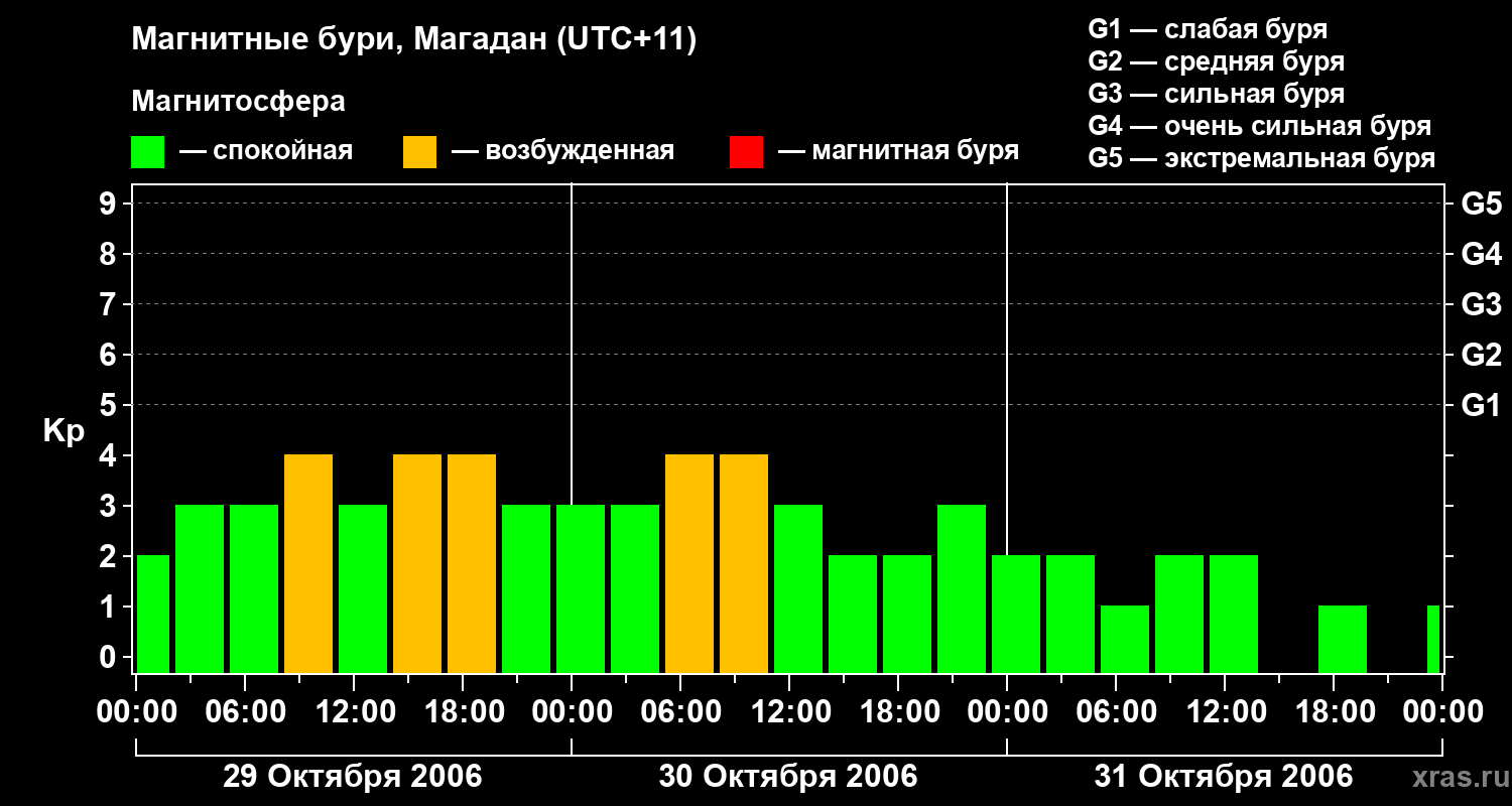 Изменения геомагнитного индекса Kp с 29 по 31 октября 2006 года для средних широт