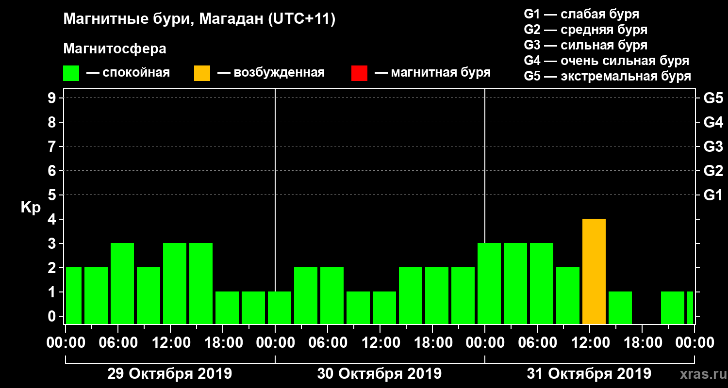 Изменения геомагнитного индекса Kp с 29 по 31 октября 2019 года для средних широт